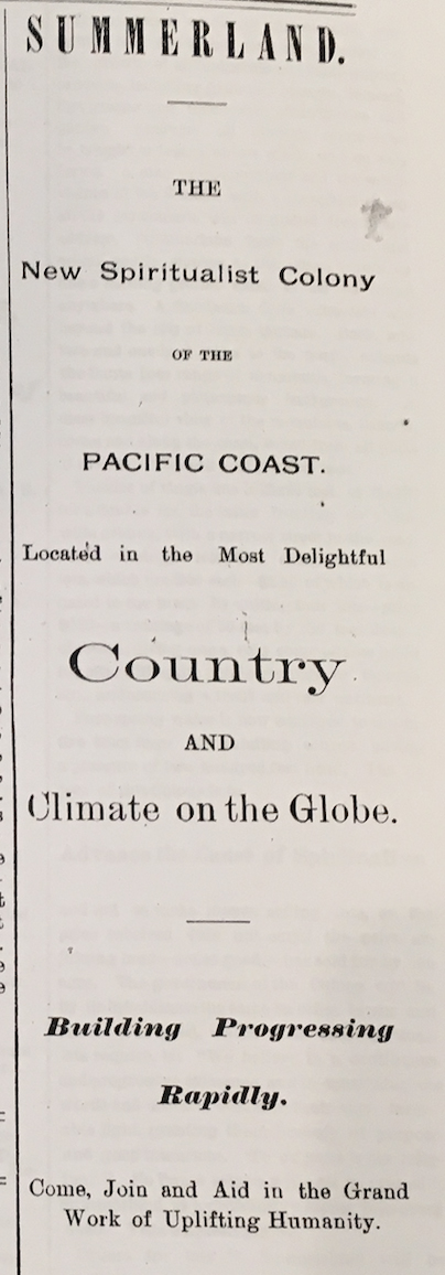 Wife Katie had been ill for several years and died shortly before the launch of Summerland’s spiritualist colony. Williams soon remarried, and his second wife was not a spiritualist. Still, the whole town attended the wedding; and, for a couple years, Williams continued to lecture and write about his uplifting ideals for the new town. In addition, he became known for his kindness and flexibility when settlers needed help with the costs of joining the colony.