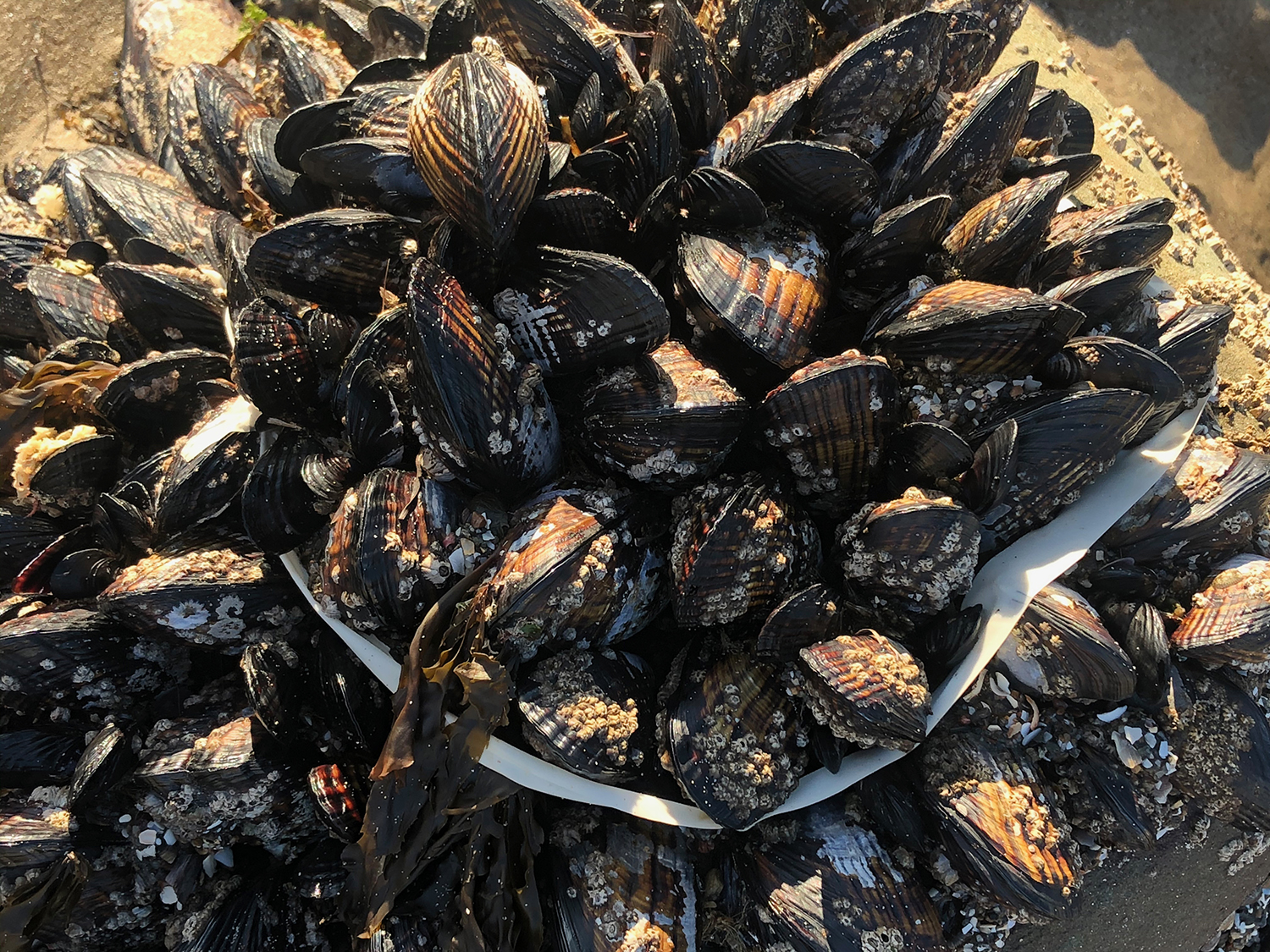 These mussels have worked around a band of white plastic: